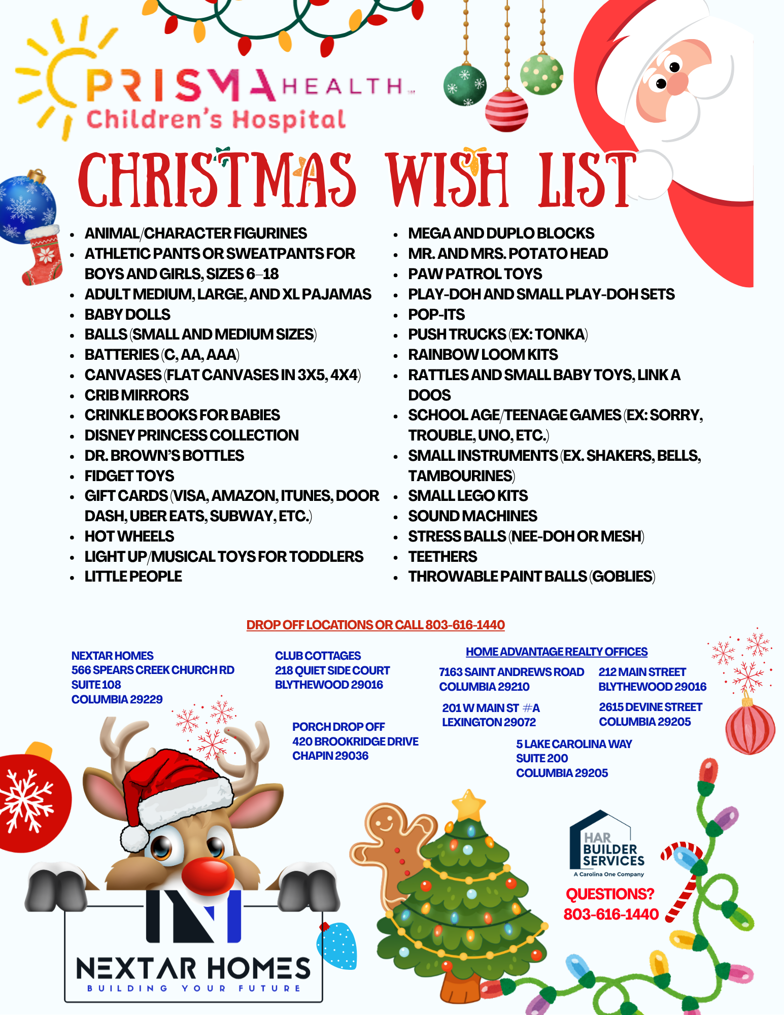The holiday season is a time for giving — a time to come together as a community, share joy, and make a difference in the lives of others. This year, Nextar Homes is proud to continue our tradition of giving back by supporting Prisma Health Children’s Hospital through December 15.
