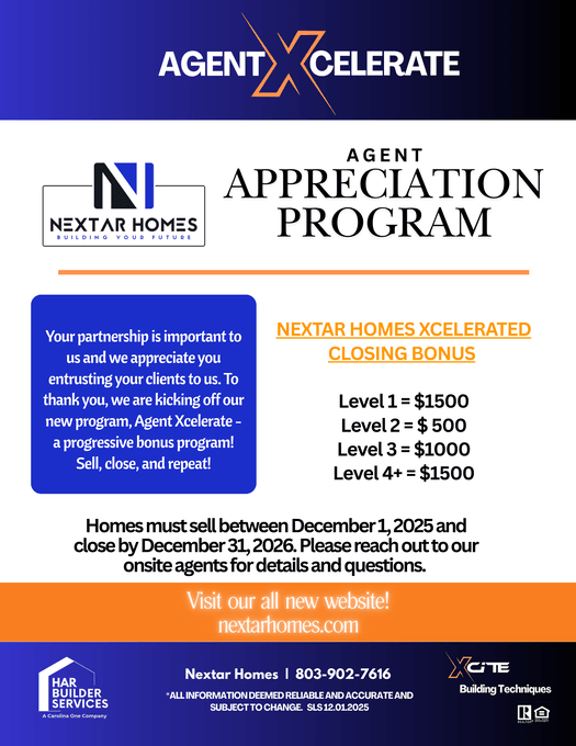 Nextar Homes values the essential role real estate professionals play in connecting homebuyers with their ideal properties. We are dedicated to building strong relationships with agents through open communication, superior homes, and collaborative support throughout the sales process.
